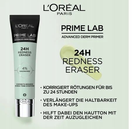 L’Oréal Paris Prime Lab 24H Redness Eraser, 30 ml, Kremy tonujące dla kobiet, Nie tylko podkład sprawia, że skóra wygląda idealnie przez cały dzień. Ważną rolę odgrywa również baza, którą nakładamy na skórę w pierwszej kolejności. Baza pod podkład L’Oréal Paris Prime Lab 24H Redness Eraser doskonale wygładzi skórę i idealnie przygotuje ją do kolejnych etapów makijażu. Stworzy równomierną powłokę na skórze, która nie tylko ułatwi aplikację makijażu, ale także przedłuży jego trwałość. Pozwoli Ci to osiągnąć idealny wygląd makijażu, niezależnie od tego, na jaki styl się zdecydujesz. Przenieś swój makijaż na wyższy poziom i osiągnij jeszcze lepsze rezultaty z ulubionym makijażem dzięki tej bazie pod podkład. Właściwości: doskonale przygotowuje skórę do nałożenia makijażu ujednolica koloryt skóry nadaje delikatność rozjaśnia Sposób użycia: Nakładaj równomiernie na oczyszczoną skórę z nałożonym produktem pielęgnacyjnym. Dokładnie rozprowadź na skórze. Następnie nałóż swój ulubiony podkład.
