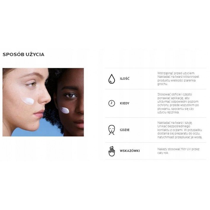 Stosować obficie i często ponawiać aplikację, aby utrzymać odpowiedni poziom ochrony, przede wszystkim po pływaniu, spoceniu się czy użyciu ręcznika.