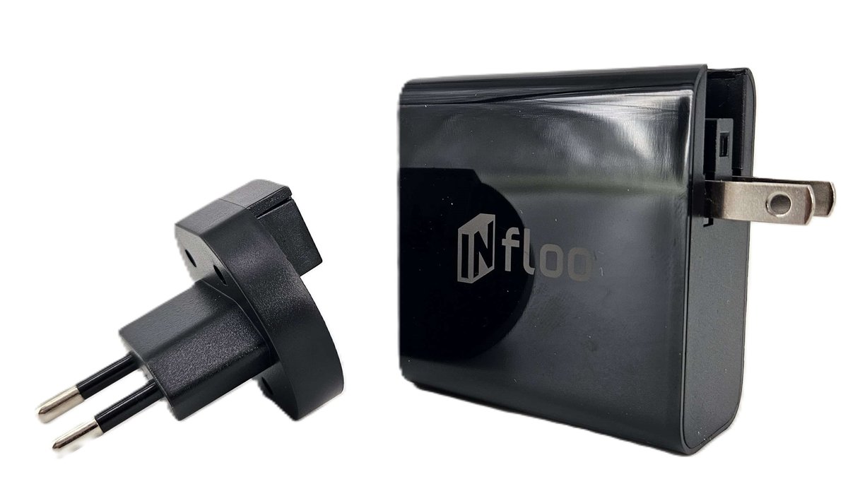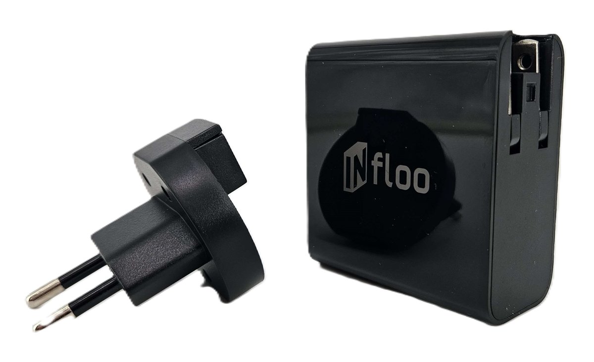Ładowarka INfloo 65W została zaprojektowana z myślą o mobilności. Wyposażona jest w fabrycznie zamontowaną wtyczkę do gniazdka US oraz dołączoną końcówkę US → EU, dzięki czemu bez problemu podłączysz ją zarówno w Europie, jak i w Stanach.