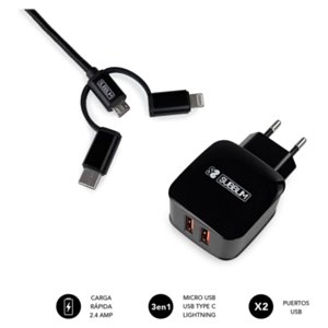 ŁADOWARKA PODRÓŻNA/ŚCIENNA USB SUBBLIM, 2 x USB (2,4 A) + CZARNY KABEL 3EN1 WNĘTRZE
