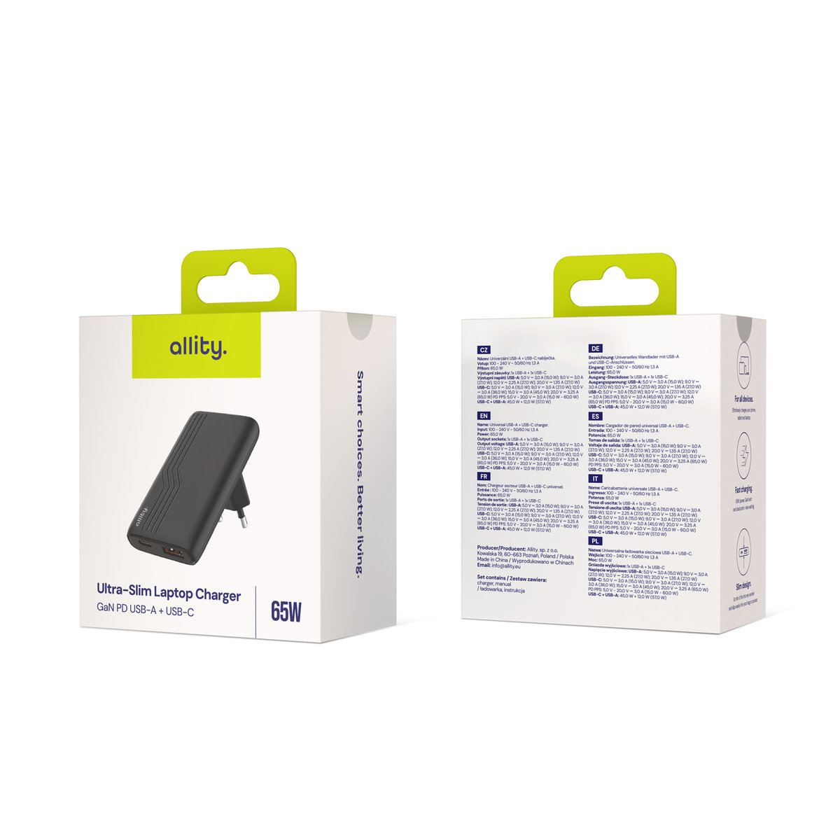 Allity ładowarka sieciowa GaN PD QC ATC-02-65WAC 1x USB-C + 1x USB-A 65W czarna Zmieści się w małej przestrzeni Gniazdko za kanapą, czy szafką nocną? Łatwo je wykorzystać z naszą płaską ...