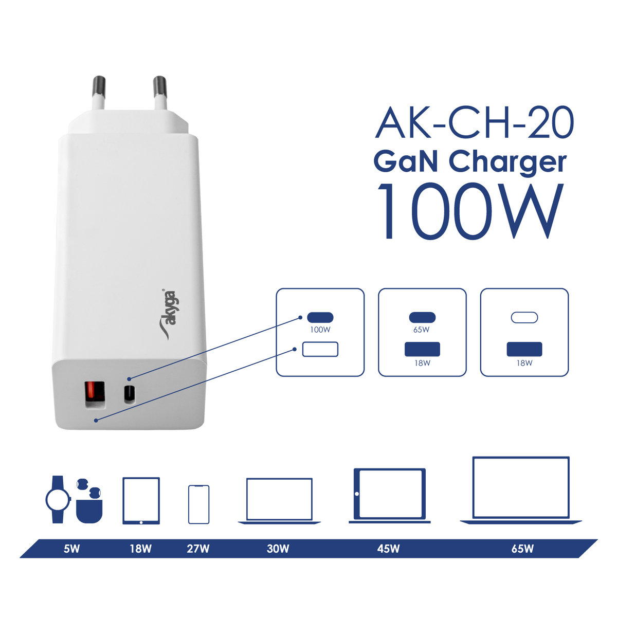Ładowarka GaN Akyga® AK-CH-20 to nowoczesne rozwiązanie w dziedzinie zasilania urządzeń mobilnych. Jest lekka i poręczna, a jej wysoka wydajność pozwala na szybkie ładowanie urządzeń z maksymalną mocą 100 W. Co więcej, zastosowanie nowego materiału GaN pozwoliło na znaczne zmniejszenie wymiarów ładowarki. Dlatego zasilacz idealnie sprawdzi się zarówno w domu, jak i na wyjeździe. Ładowarka sieciowa posiada dwa porty USB. Jeden port USB typu A o mocy 18 W i jedno gniazdo USB typu C (100 W). Dzięki temu można nią naładować dwa urządzenia jednocześnie. Ponadto, ładowarka wspiera technologie Quick Charge 3.0 oraz Power Delivery 3.0. Odpowiadają one za szybkie i bezpieczne ładowanie. Dlatego ładowarka sprawdzi się zarówno w zasilaniu smartfonów, jak i laptopów i innych urządzeń używanych w podróży.