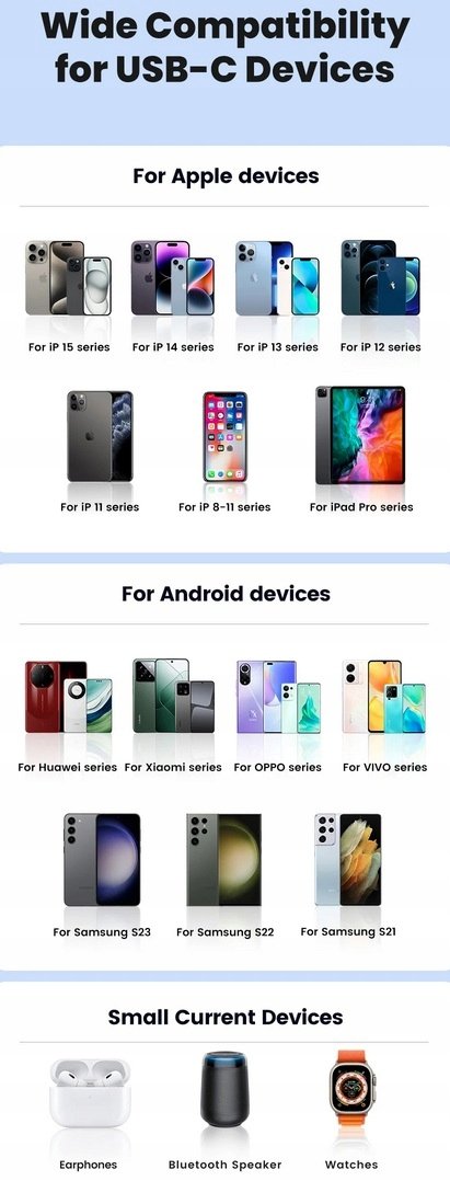 telefonów z systemem Android, tabletów, głośników bezprzewodowych i słuchawek, sprzętu fotograficznego, power banków, lampek i innych urządzeń ładowanych przez port USB-C,