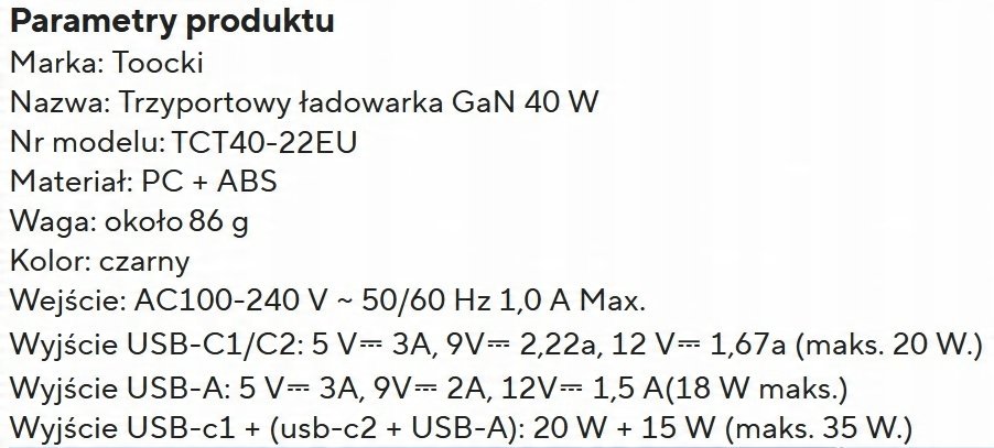Ładowarka sieciowa Toocki 40W – 1sztuka (oryginalnie zapakowane przez producenta).