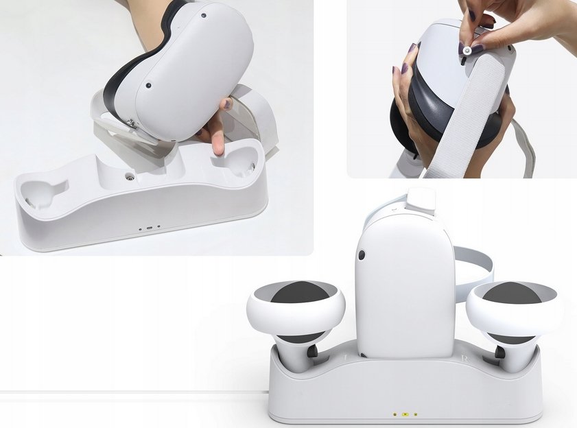 Stacja ładująca / Ładowarka / Stojakdo okularów i kontrolerów+ Akumulatory zasilające do kontrolerówdo:Oculus Quest 2ZALETY: Kompleksowe ładowanie gogli i kontrolerów Ładowanie gogli i kontrolerów za