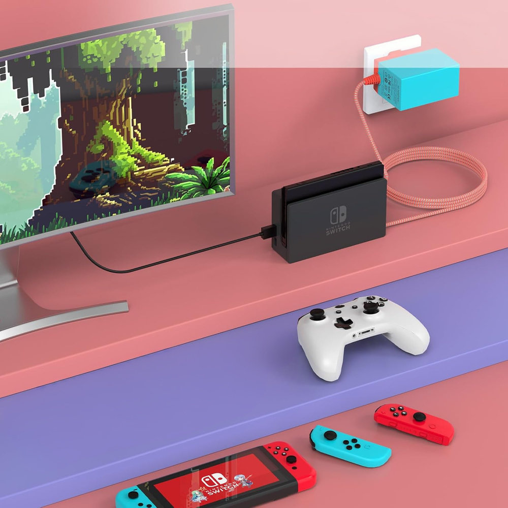 - Zgodność z trybem TV i dokiem Switch Dock – zapewnia zgodność z trybem TV i trybem przenośnym. Użyj zasilacza w trybie TV, aby kontynuować grę podczas ładowania, dzięki czemu możesz cieszyć się domowymi konsolami do gier w dowolnym czasie i miejscu.