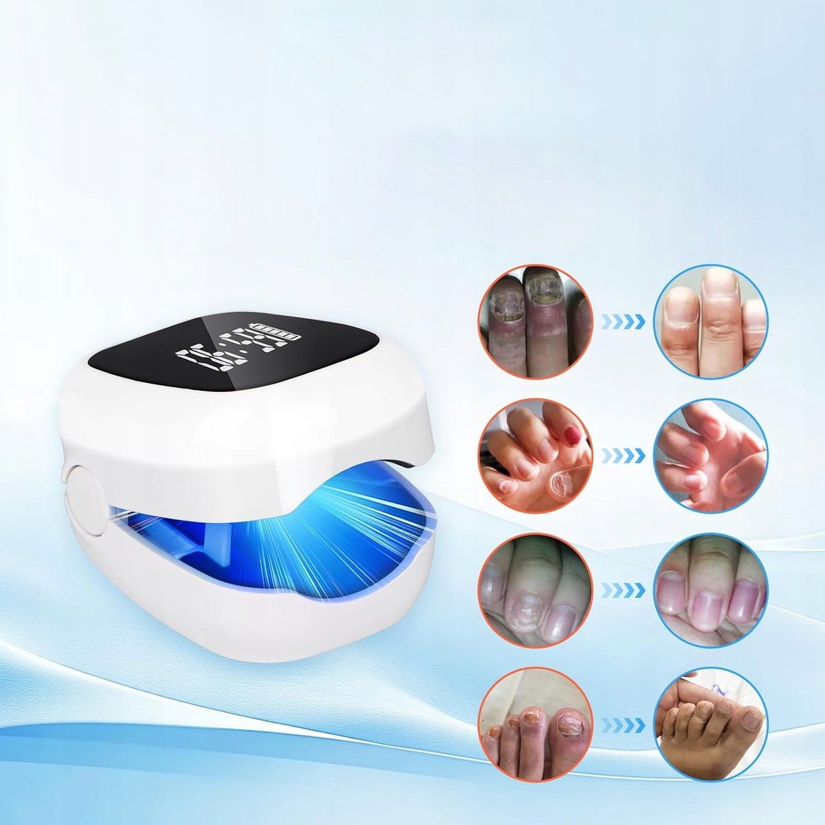 Ten leczniczy aparat do paznokci z wyświetlaczem cyfrowym posiada wbudowany inteligentny czip, który pokazuje stan pracy i poziom baterii🔋. Bez konieczności obsługi – wystarczy przypiąć go do leczonego obszaru, a urządzenie automatycznie rozpocznie pracę⚡!