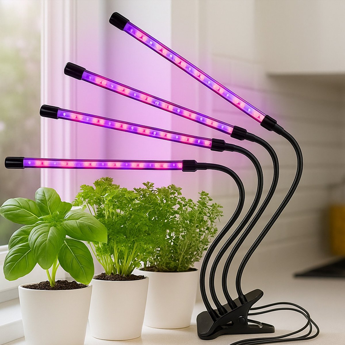 Lampa LED do doświetlania roślin – 4 ramiona na giętkich wysięgnikach z klipsem ??Chcesz, aby Twoje rośliny wyglądały zdrowo i pięknie przez cały rok, niezależnie od pogody i ilości światła ...