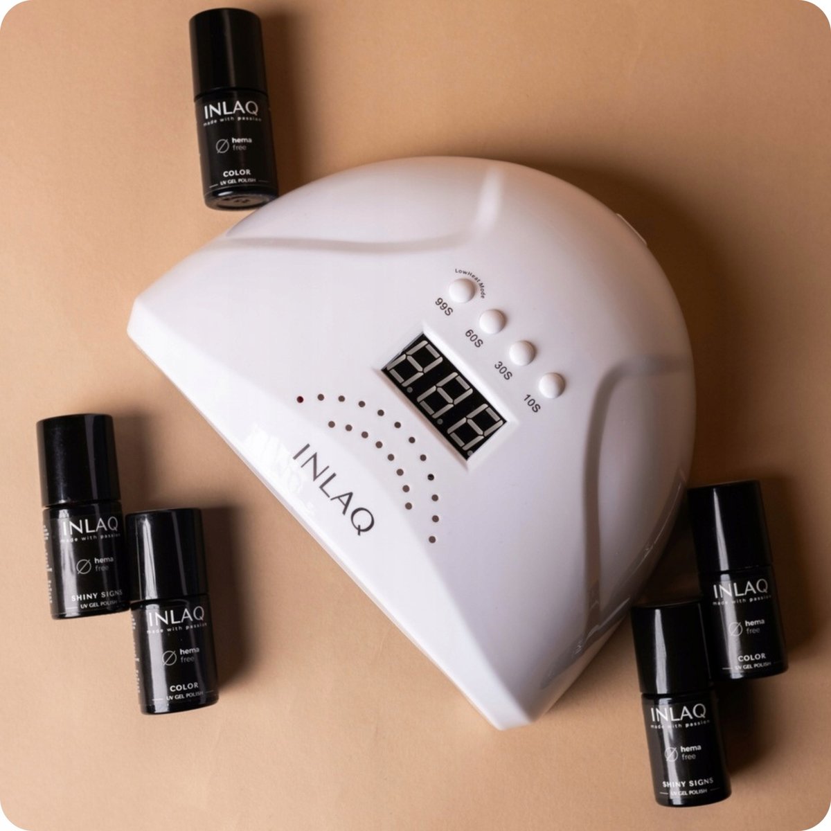 Lampa INLAQ to narzędzie do utwardzania lakierów hybrydowych i żeli w salonie kosmetycznym lub w domowym zaciszu. Dzięki nowoczesnym technologiom i funkcjom, zapewnia skuteczne i komfortowe utwardzanie, które umożliwia uzyskanie pięknych i trwałych paznokci.