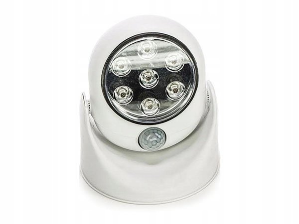 Lampka z diodami 7 LED z czujnikiem ruchu to idealne źródło światła w zaciemnionym miejscu. Lampka po wykryciu zapala się na 30 sekund po czym gaśnie, chyba, że wykryje ruch.
