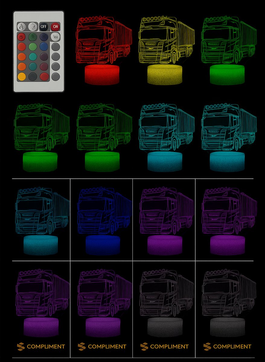 Ta nowoczesna lampka 3D z realistyczną wizualizacją TIR-a to doskonały wybór! Dzięki 16 kolorom świecenia i sterowaniu pilotem sprawdzi się zarówno jako dekoracja pokoju, jak i klimatyczne światło nocne w szoferce lub biurze.