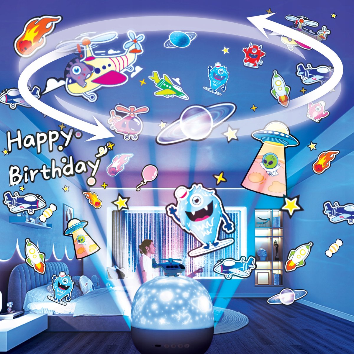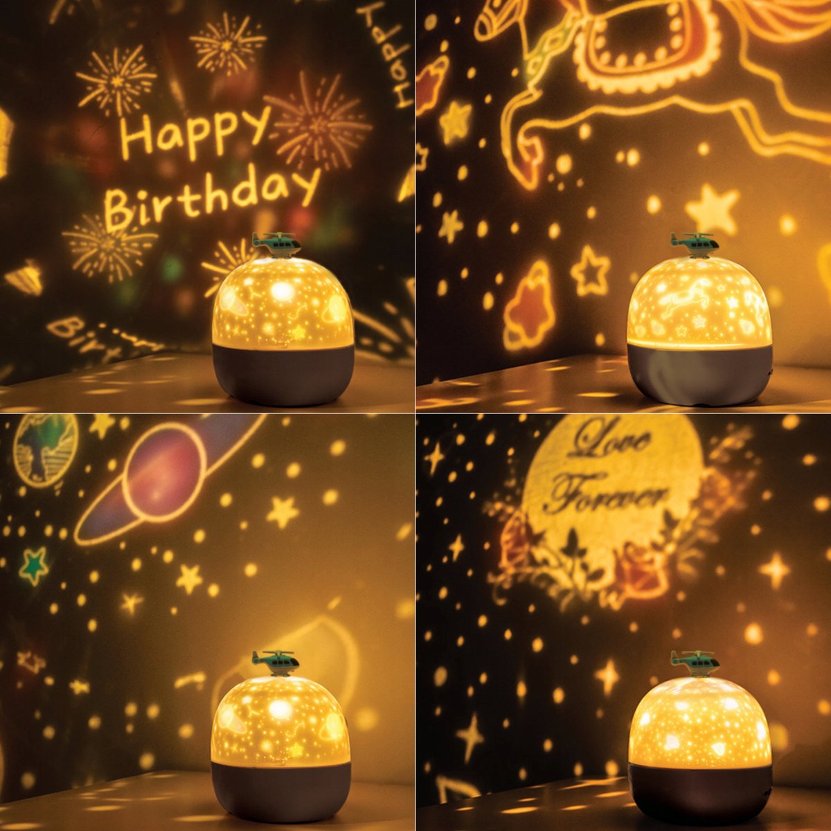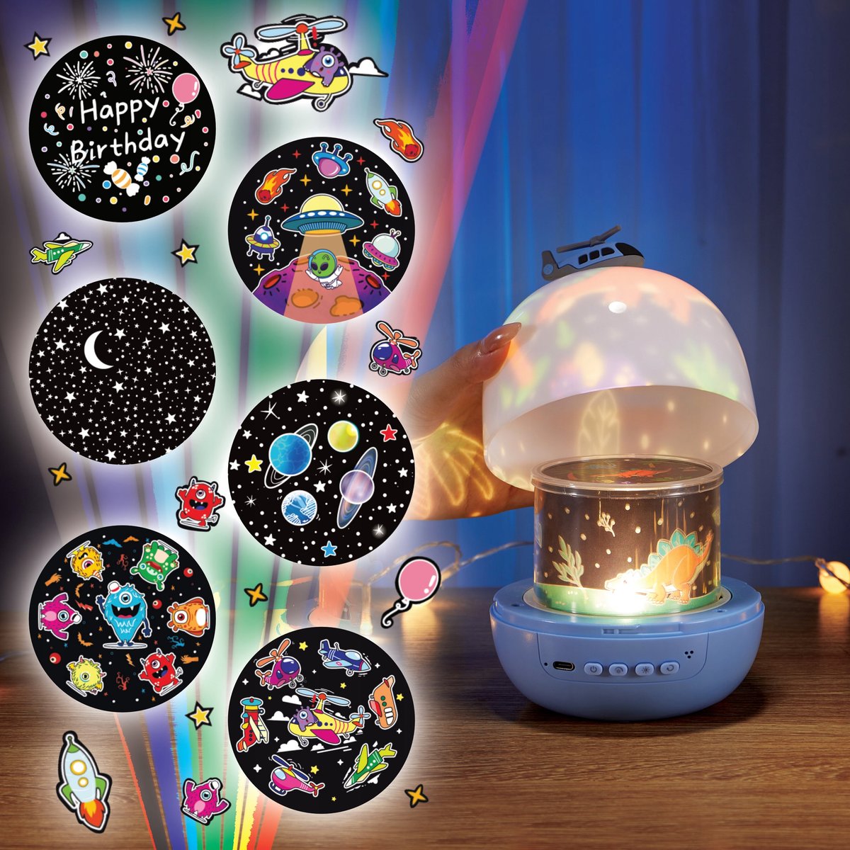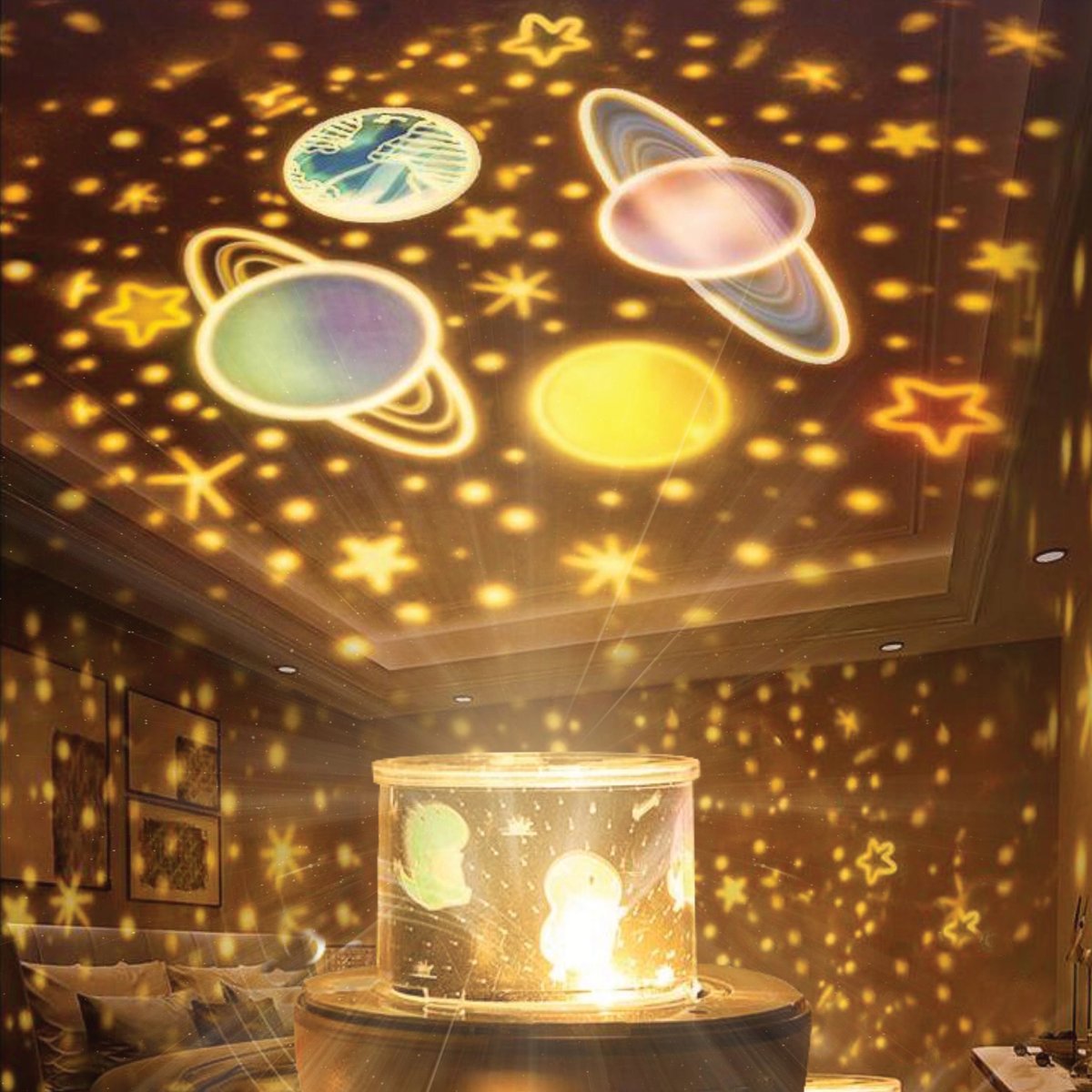 - Projektor LED z obracanym wzorem – po zdjęciu osłony lampka zamienia się w projektor wyświetlający kolorowe wzory na suficie lub ścianie. Do dyspozycji masz aż 6 wymiennych motywów projekcyjnych, które możesz łatwo zmieniać, dopasowując efekty świetlne do okazji, pory dnia lub nastroju. Każdy z motywów tworzy inny, wyjątkowy klimat – od kosmicznych przestrzeni po bajkowe wzory. Ruch obrotowy sprawia, że efekty świetlne są jeszcze bardziej dynamiczne i hipnotyzujące – szczególnie efektowne w całkowicie zaciemnionym pomieszczeniu.