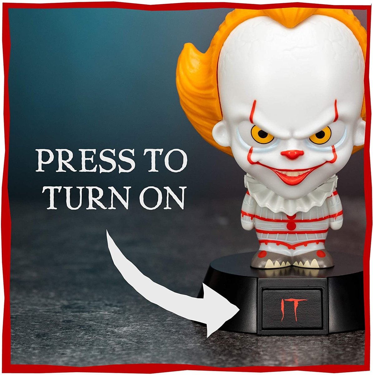 Lampka Pennywise It / To 3D - 10 cm Oryginalny i Licencjonowany Produkt !!! Posiada funkcję podświetlania podstawy Wykonana z plastiku Wysokość : 10 cm Zasilana na 2 baterie AAA (brak baterii w ...