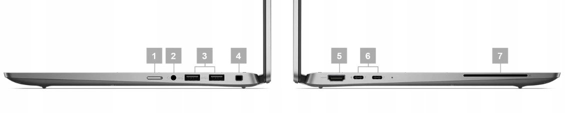 1. Slot na kartę NanoSIM (Opcjonalnie) | 2. Wejście audio | 3. 2x USB-A 3.2 Gen.1 | 4. Gniazdo blokady klinowej | 5. HDMI 2.1 | 6. 2x Thunderbolt 4 / USB4 (z Power Delivery i DispalyPort) | 7. Czytnik Smart Card (Opcjonalnie)