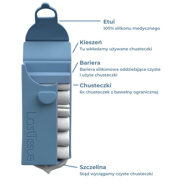 Wyjmij czystą chusteczkę przez szczelinę w dolnej części etui, użyj jej, a następnie otwórz etui i włóż ją do górnej części przeznaczonej na zużyte chusteczki, oddzielonej silikonową barierą. W ten sposób zepchniesz pozostałe czyste chusteczki w dół, czyniąc je gotowymi do użycia.