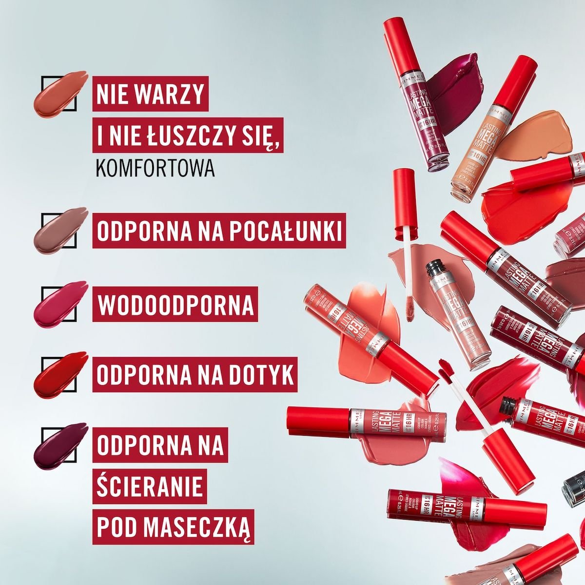 Odkryj szminkę Lasting Mega Matte marki Rimmel London i ciesz się niesamowitym kolorem przez cały dzień. Ta wegańska pomadka w płynie zawiera megaelastyczne pigmenty, które wtapiają się w usta i zapewniają obłędnie matowe wykończenie. Pomadka nie ściera ani nie zbryla się, dzięki czemu możesz cieszyć się perfekcyjnym, długotrwałym makijażem aż do 16 godzin! Unikalna formuła została wzbogacona uwielbianymi przez usta składnikami nawilżającymi, takimi jak skwalan i olej kokosowy. Wygodny aplikator typu drip-tip pozwala na szybkie i precyzyjne nałożenie kosmetyku. Produkt jest odporny na wodę, pocałunki i ścieranie oraz nie rozmazuje się pod maseczką. Dostępny w 9 mega atrakcyjnych odcieniach.