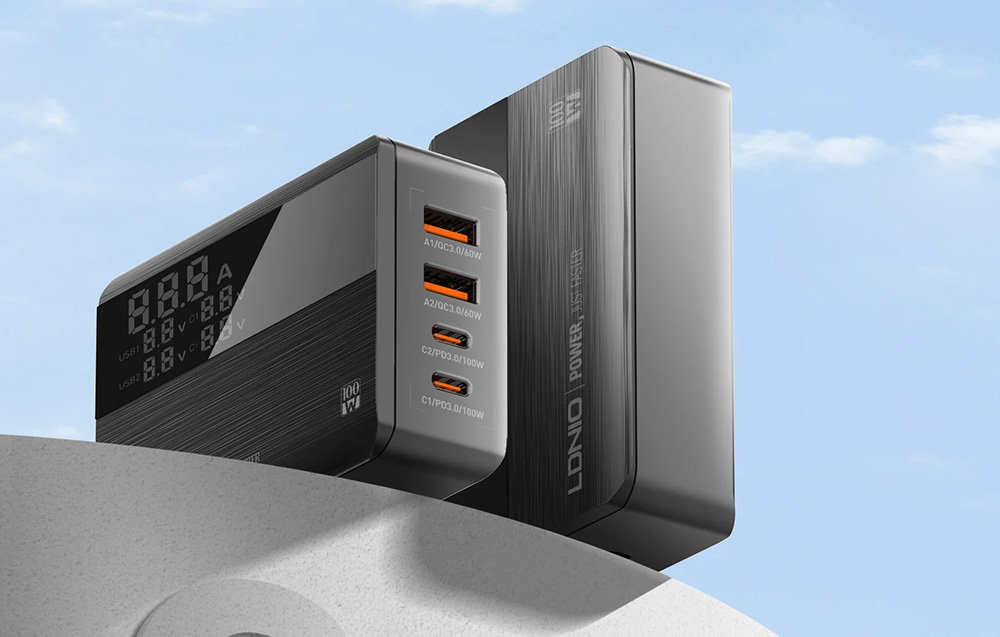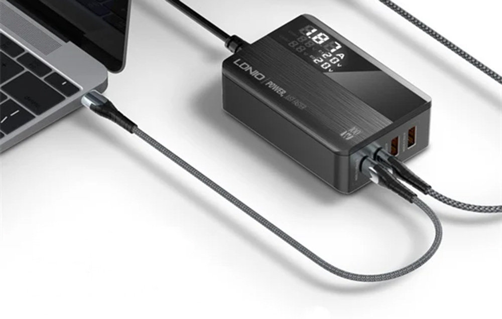 Teraz możesz w krótkim czasie naładować nawet 4 urządzenia jednocześnie. Ładowarka LDNIO A4809C została wyposażona w 4 porty (2x USB-C, 2x USB-A) i wykorzystuje zaawansowaną technologię GaN, która pozwala uzyskać niesamowitą wydajność. Produkt oferuje całkowitą moc wyjściową nawet 100 W i obsługuje różne standardy szybkiego ładowania. Zapewnia też bezpieczeństwo użytkowania i ma wbudowany wyświetlacz.
