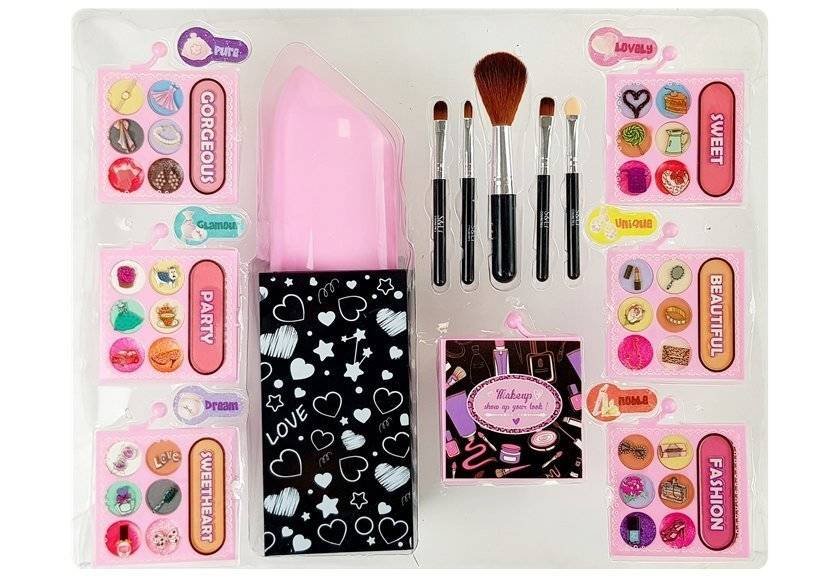Dziewczynka może wybrać spośród 6 paletek, w której znajdują się 4 cienie i 2 błyszczyki oraz bronzer lub róż. Każda z nich podzielona tematycznie na wyjątkowe okazję: party, sweet, beautiful. Lusterko znajdujące się w zestawie, ma miejsce na paletkę, wystarczy włożyć ją do środka i można ją zabrać ze sobą wszędzie, w zależności od wyboru zestawie.