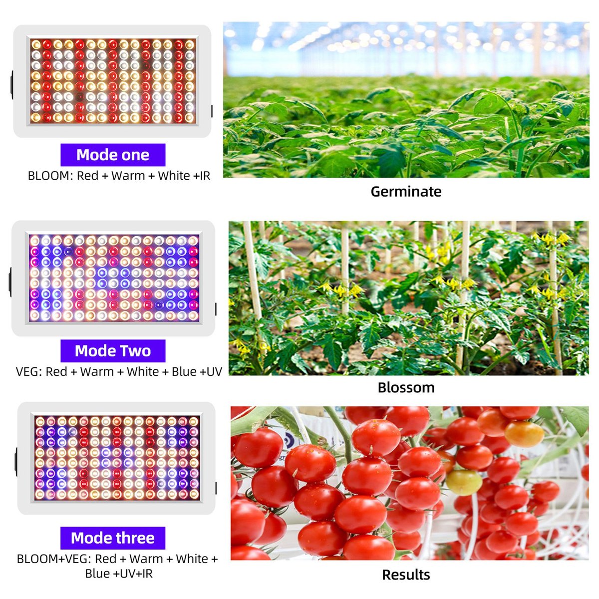 Tryb: 30 - 35W 2663lm VEG (światło czerwone + ciepłe światło + białe światło + niebieskie światło + UV), 30 - 35W 2747lm BLOOM (światło czerwone + ciepłe światło + białe światło + IR), 65 - 70W 5346lm VEG + BLOOM (światło czerwone + ciepłe światło + białe światło + niebieskie światło + UV + IR)