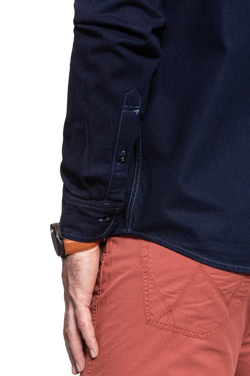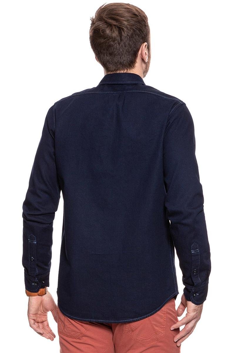 męska koszula jeansowa w granatowym kolorzemodel ten charakteryzuje regularny krój, jedna kieszonka oraz zapięcie na guzikimateriały wysokiej jakości