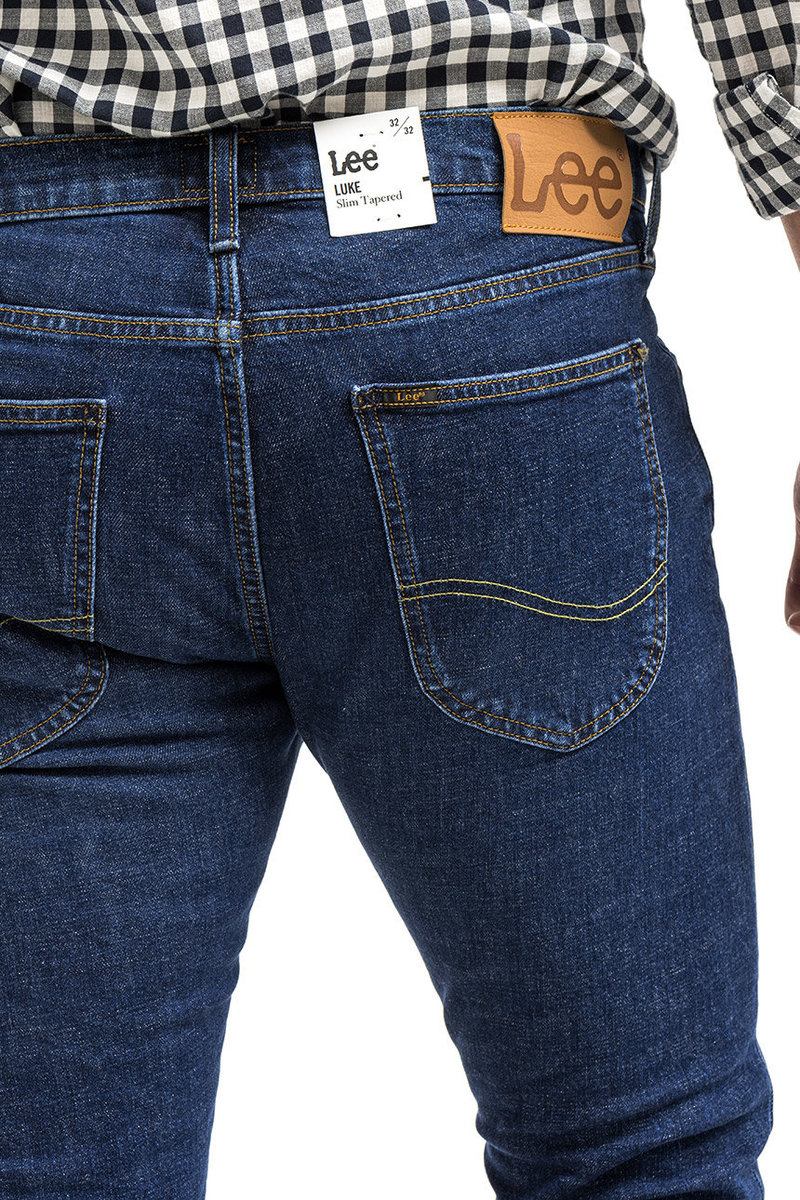 Spodnie jeansowe LEE LUKE zachwycają swoją barwą – głębokim, hipnotyzującym grantem, oznaczonym przez producenta jako DK Worn Kansas. Większość szwów i przeszyć zostało wykonanych jasnobrązową nicią. Na tylnej prawej kieszeni zamieszczono niewielkie logo firmy LEE na czarnym tle. W tylnej części spodni przy pasku widnieje duża skórzana naszywka w kolorze jasnego brązu z wytłoczoną nazwą marki. Jeansy posiadają delikatne przejaśnienia.