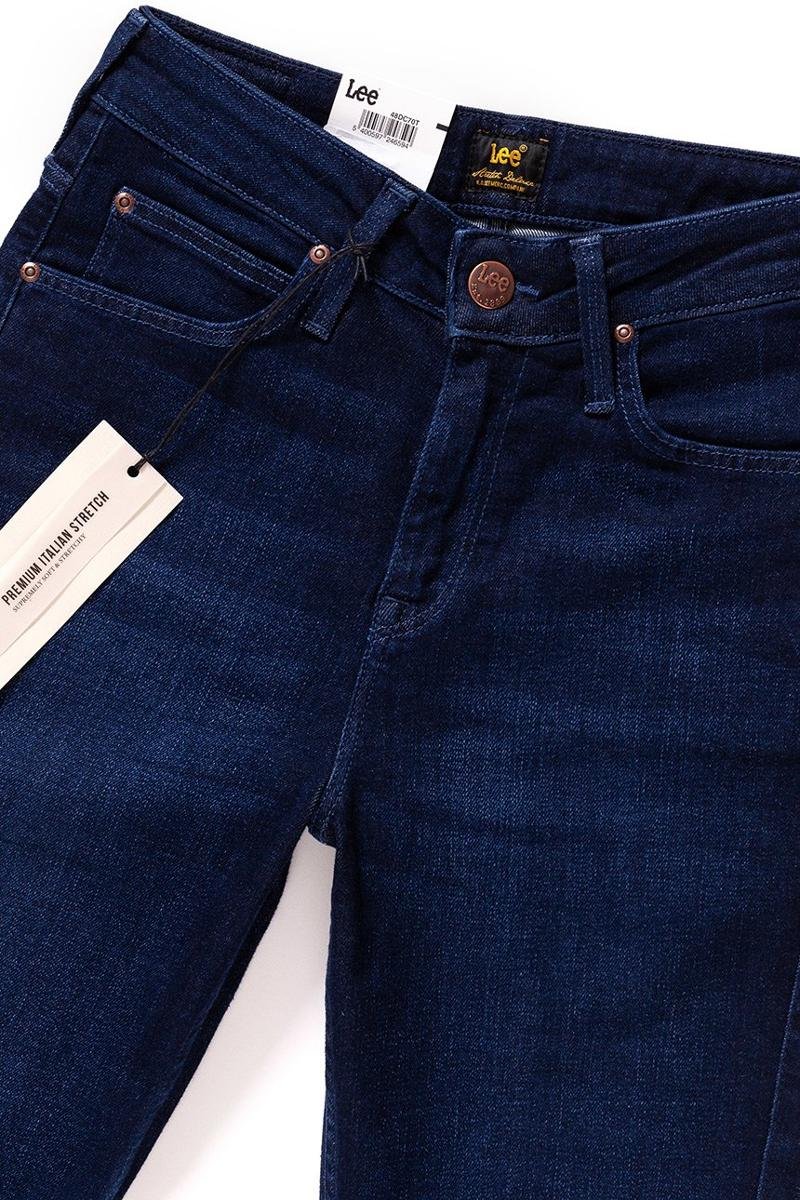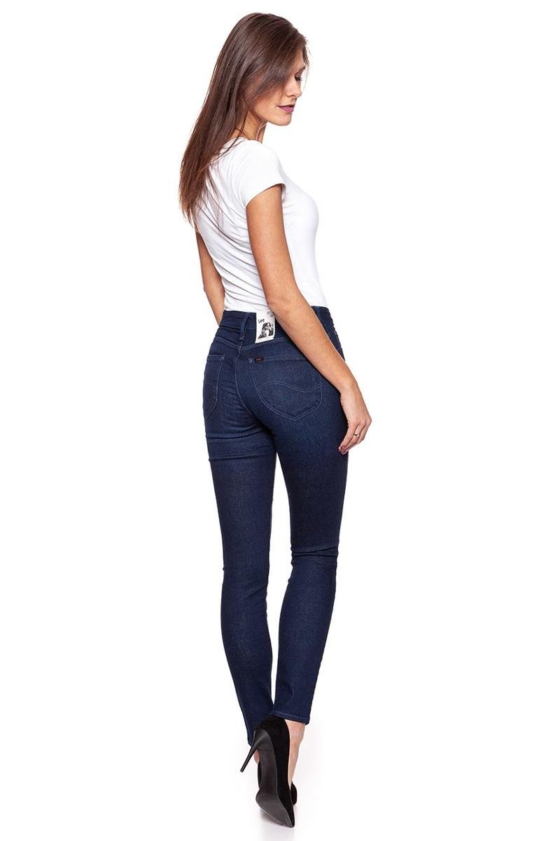 damskie spodnie jeansowe marki Lee w granatowym, delikatnie wycieranym kolorze dopasowany krój, wyższy stan na tylnej, prawej kieszonce oraz pasku charakterystyczne naszywki z logo producenta
