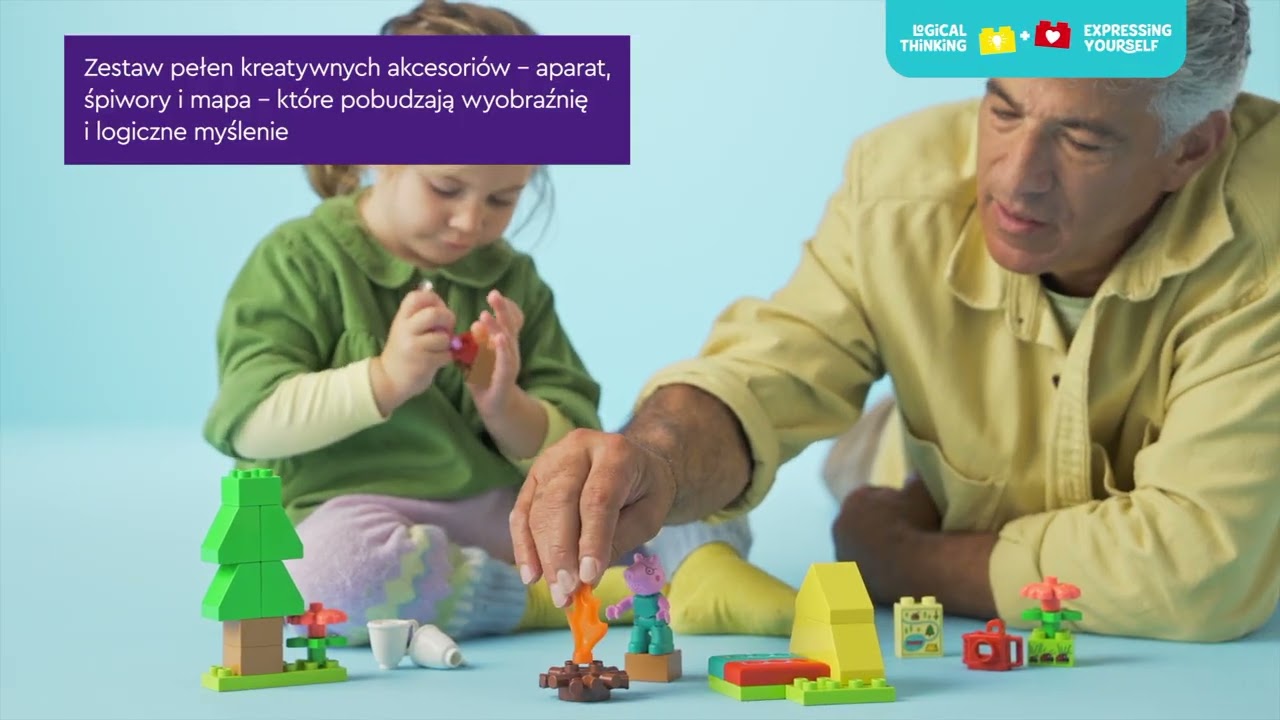 Zestaw LEGO DUPLO Peppa zaprasza maluchy na przygodę na biwaku. Dzieci dołączą do Świnki Peppy i Taty Świnki, odkrywając radość z przebywania na łonie natury. Wspólna zabawa pozwala najmłodszym poznawać emocje towarzyszące doświadczeniom, takim jak nocowanie w namiocie czy spływ kajakiem po rzece. Kreatywne klocki DUPLO dla 2-latka oferują mnóstwo fajnych akcesoriów, które inspirują do odgrywania scenek – namiot z dwoma śpiworami, ognisko, kubki i mapa pomagają maluchom rozwijać logiczne myślenie i koordynację wzrokowo-ruchową.