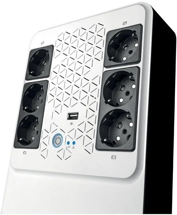 UPS o mocy pozornej 600 VA wyposażony w elektroniczny układ AVR. Praca w trybie Line-Interactive. 6 gniazd zasilających, 1 gniazdo USB oraz RJ45.