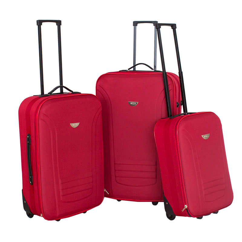 Zestaw 3 walizek z kolekcji MILA. Wykonane zostały z wysokiej jakości grubego materiału. Bardzo lekkie i poręczne, o sztywnej konstrukcji. Walizki zamykane są na suwak. Wewnątrz każdej znajdują się pasy do mocowania bagażu oraz kieszonka na zamek. Dodatkowym atutem są wygodne 2 rączki do przenoszenia bagażu oraz wysuwany uchwyt, który w połączeniu z dwoma kółkami ułatwia prowadzenie walizki. Naszywki z tyłu walizek służą do oznaczenia właściciela, dla szybszej weryfikacji w razie zguby. Duża i średnia walizka ma także odbojniki, które chronią walizkę przed podłożem. Sprawdzą się przede wszystkim w podróżach lotniczych, do podróży pociągiem czy autokarem z uwagi na swoją lekkość i wymiary.