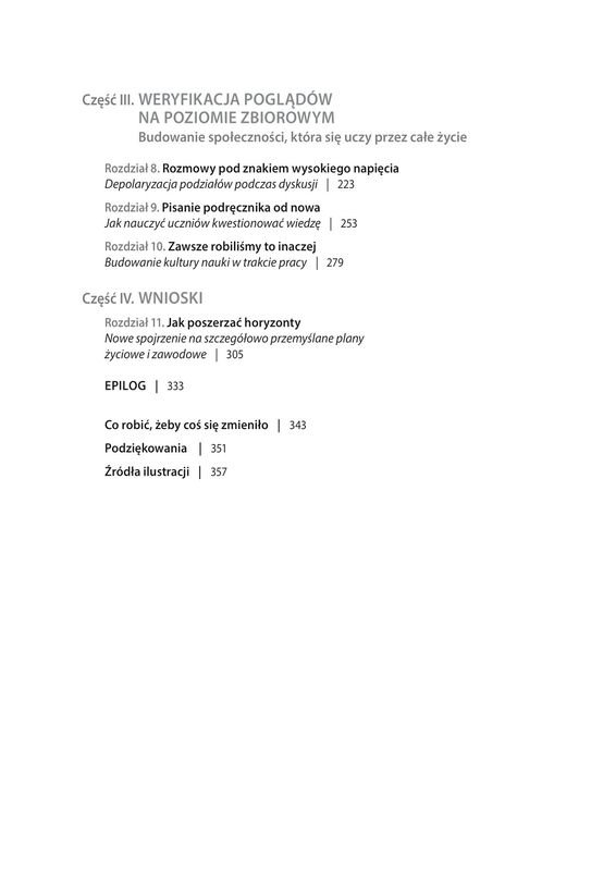 Ta książka pomaga zinternalizować sobie wszystko, co większość z nas już instynktownie wie. To zaproszenie do wyzbycia się poglądów, które nam już nie służą. To zachęta do tego, aby uwolnić się od nieracjonalnego przywiązania do stałości, a na pierwszy plan wydobyć elastyczność myślenia, ciekawość i owartość umysłu. Bo opanowanie trudnej sztuki weryfikacji dotychczasowych poglądów i decyzji zdecydowanie pozwoli zwiększyć nasze szanse na osiągnięcie sukcesu w pracy i szczęścia w życiu.