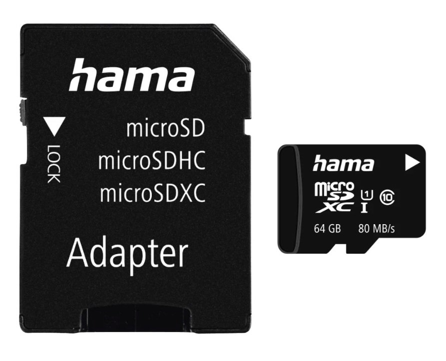 Hama MSDXC64GB C10 80MB/S +A/M Karta pamięci typu Micro SD/TransFlash Pojemność pamięci: 64GB Do nagrań w czasie rzeczywistym / nagrań w trybie Broadcast; umożliwia szybszy i bezpośredni