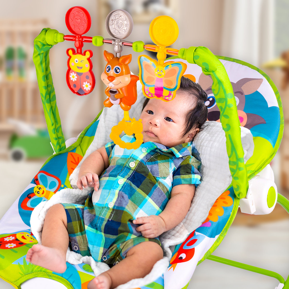 Dodatkowo nad siedziskiem znajduje się pałąk z trzema zabawkami. Można się nimi bawić na różne sposoby. Wiewiórka odtwarza przyjazną melodyjkę!