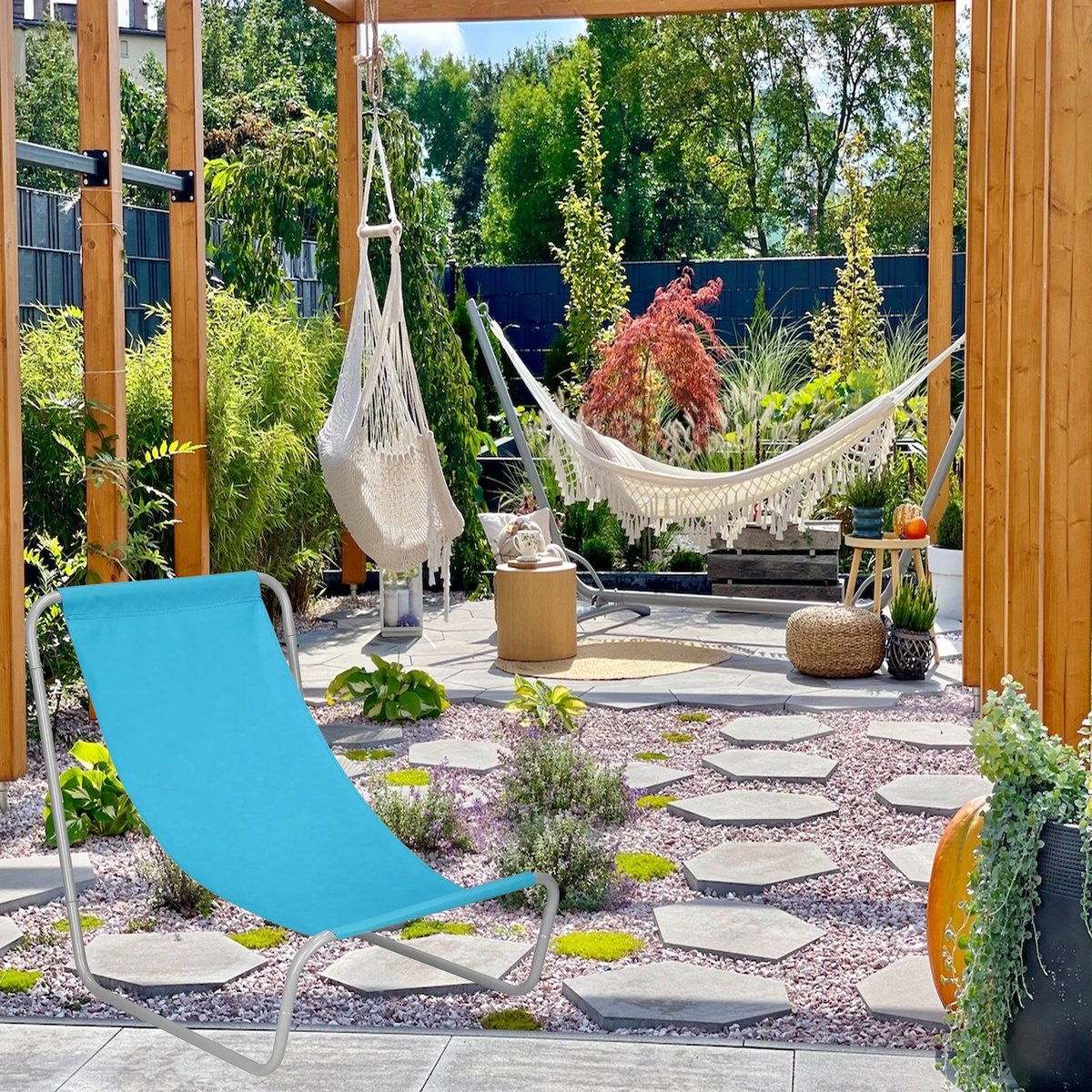 Leżak ogrodowy w niebieskim kolorze. Leżak zapewni nam komfort i chwilę relaksu, jest świetną alternatywą dla koców oraz ręczników plażowych.