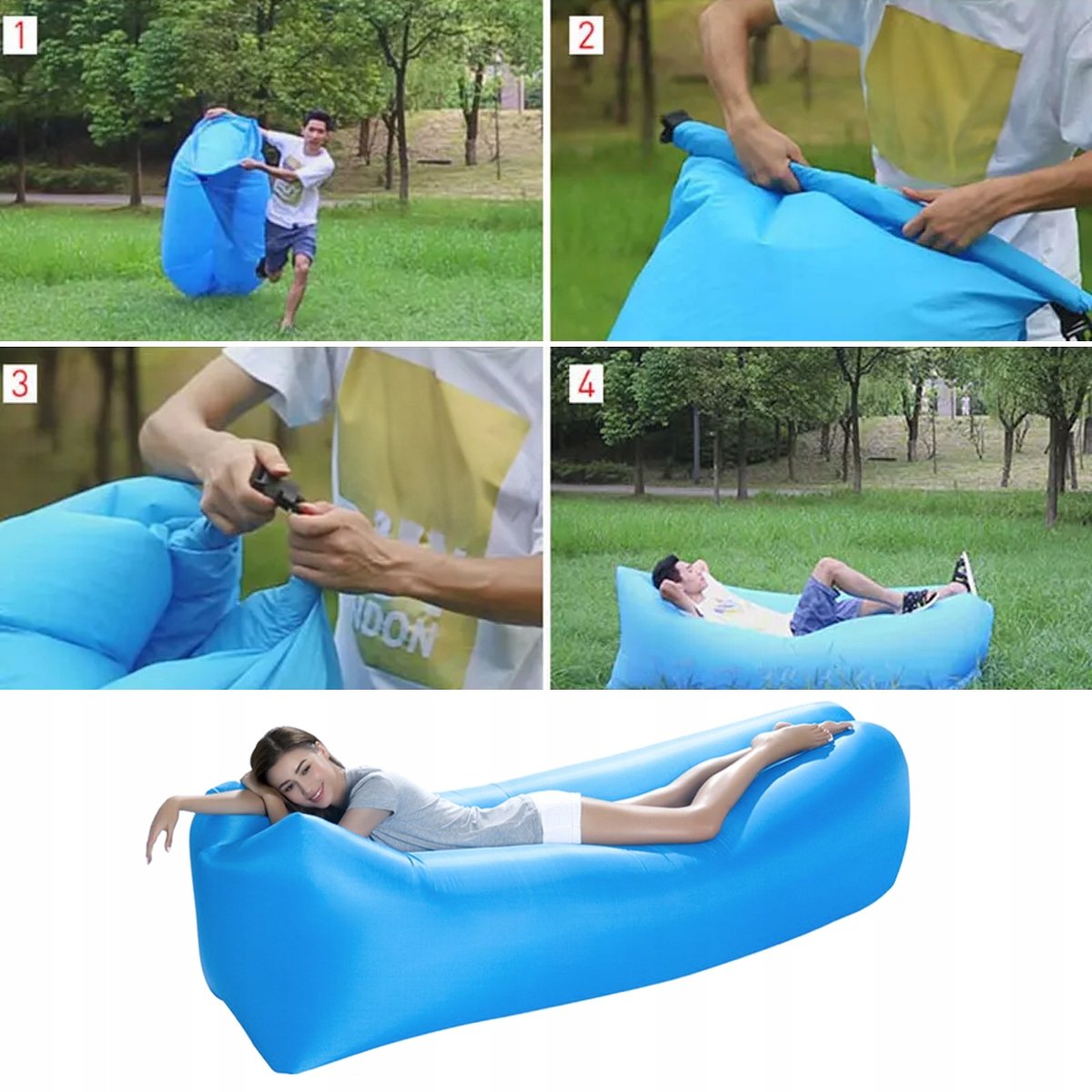 Wystarczą 3 kroki pod wiatr, a sofa zostanie wypełniona po brzegi powietrzem. Następnie należy zamknąć klamry i gotowe.