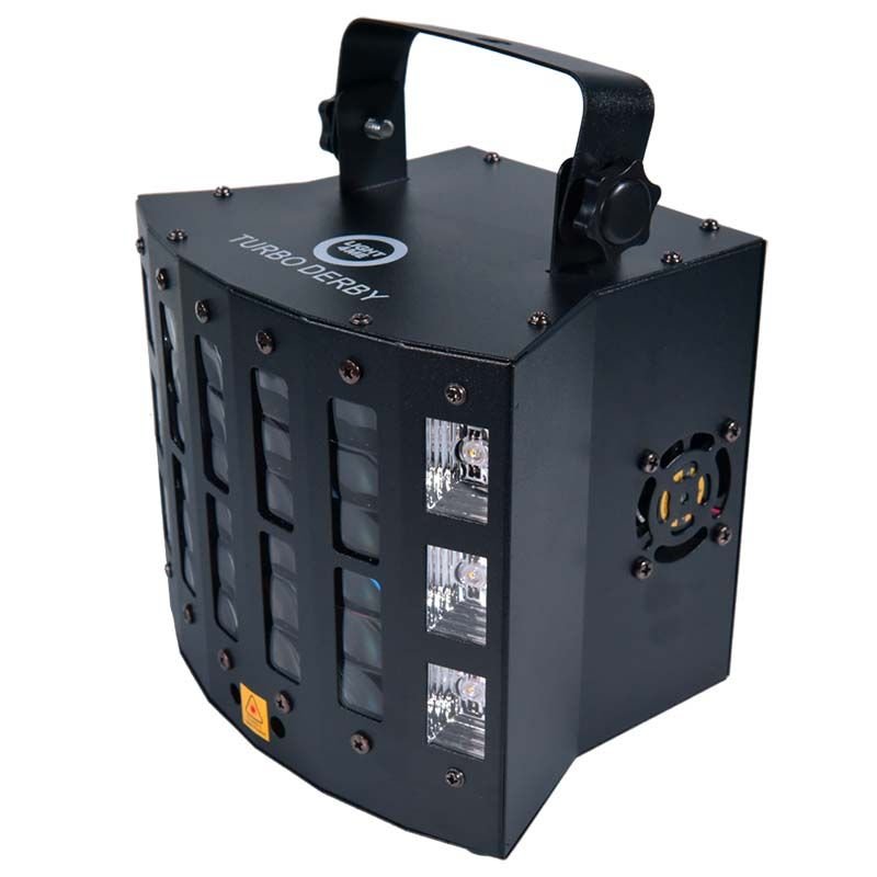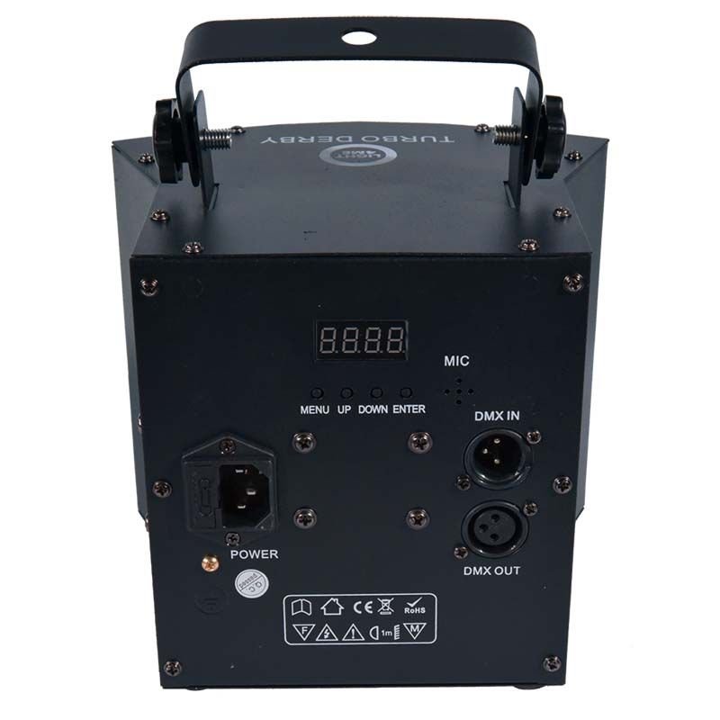 TURBO DERBY jest wyposażone w dziewięć potężnych diod LED o mocy 3 watów każda (4w1), co zapewnia intensywne i wyraziste światło. Dodatkowo, posiada układ sześciu diod LED operujących światłem ultrafioletowym (UV). Te efekty są wzmocnione przez dwa lasery emitujące czerwoną i zieloną wiązkę światła, co dodaje niepowtarzalnej głębi wizualnej.