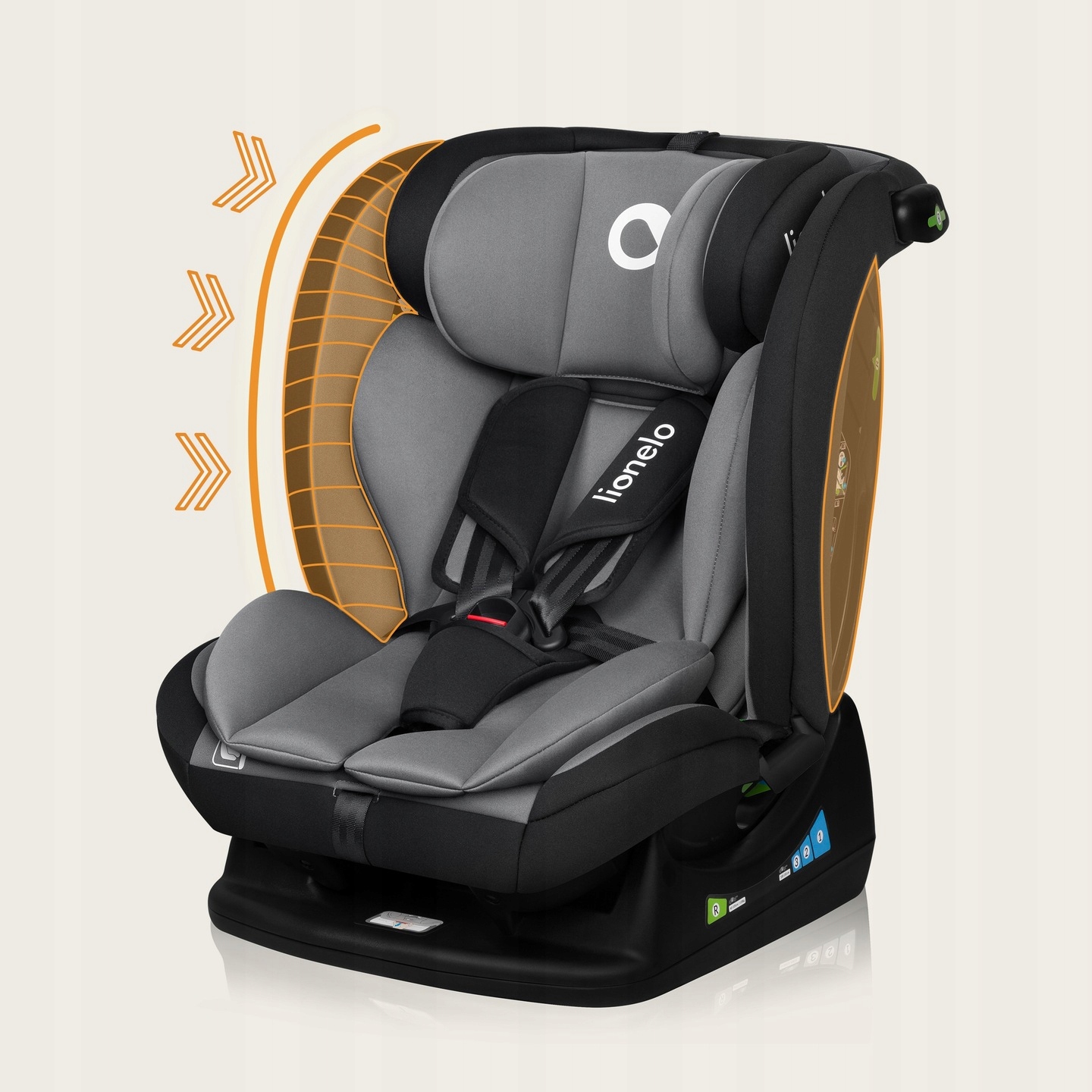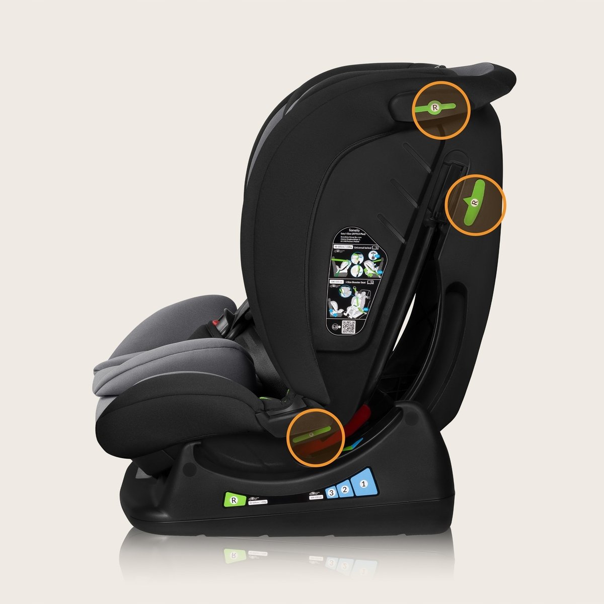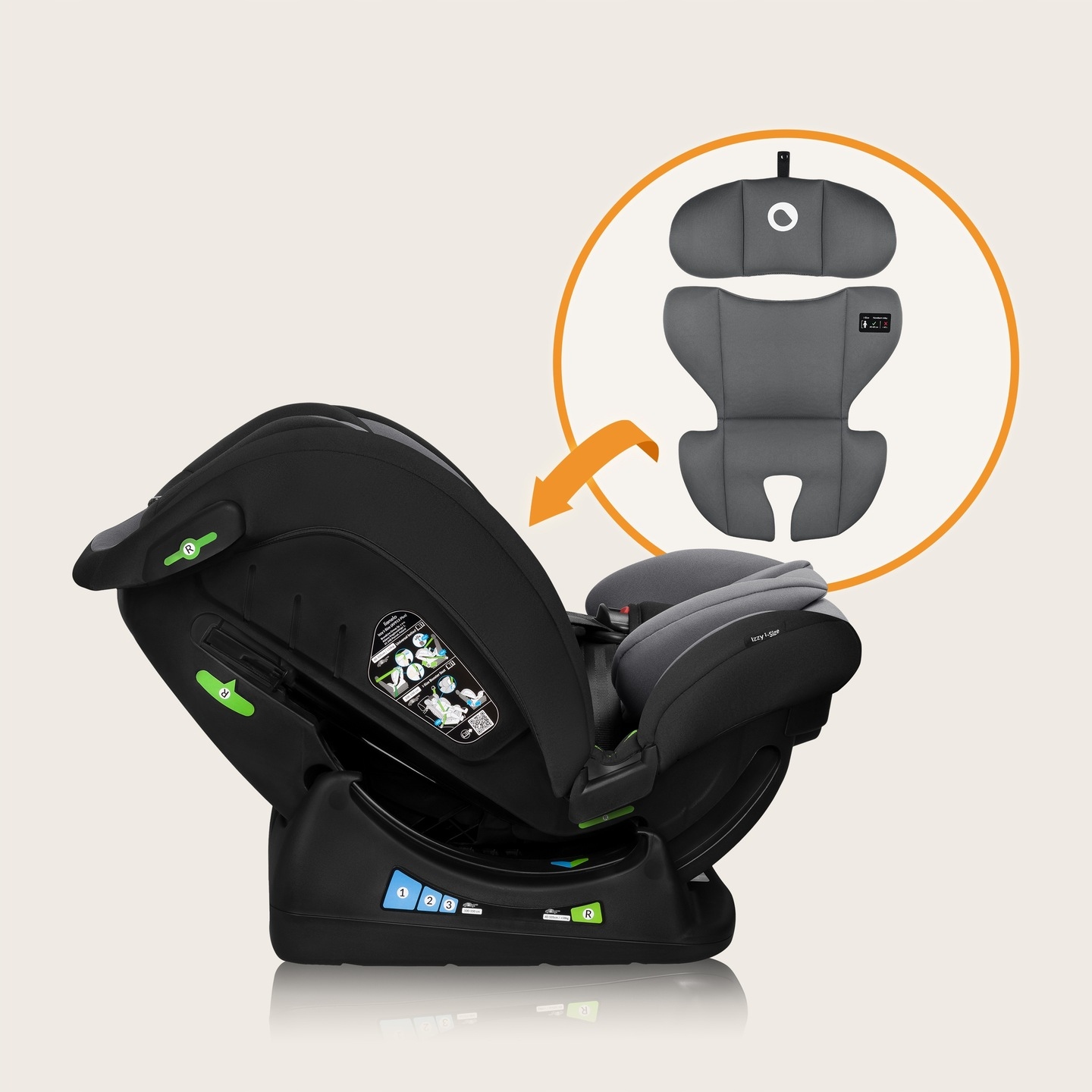 Co ważne Izzy i-Size pozwala na mocowanie fotelika w pozycji RWF (tyłem do kierunku jazdy) aż do osiągnięcia przez dziecko 105 cm – jest to rekomendowany oraz najbezpieczniejszy sposób przewożenia dziecka.
