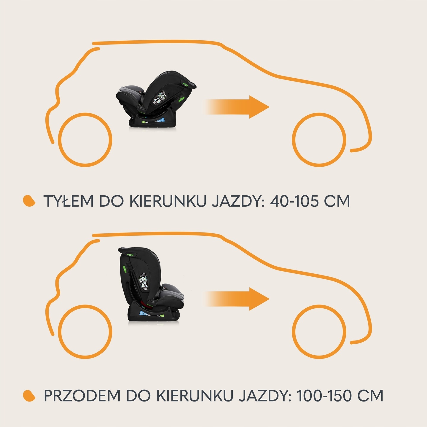 Ze względu na szeroki zakres wzrostowy fotelik umożliwia montaż zarówno przodem, jak i tyłem do kierunku jazdy.