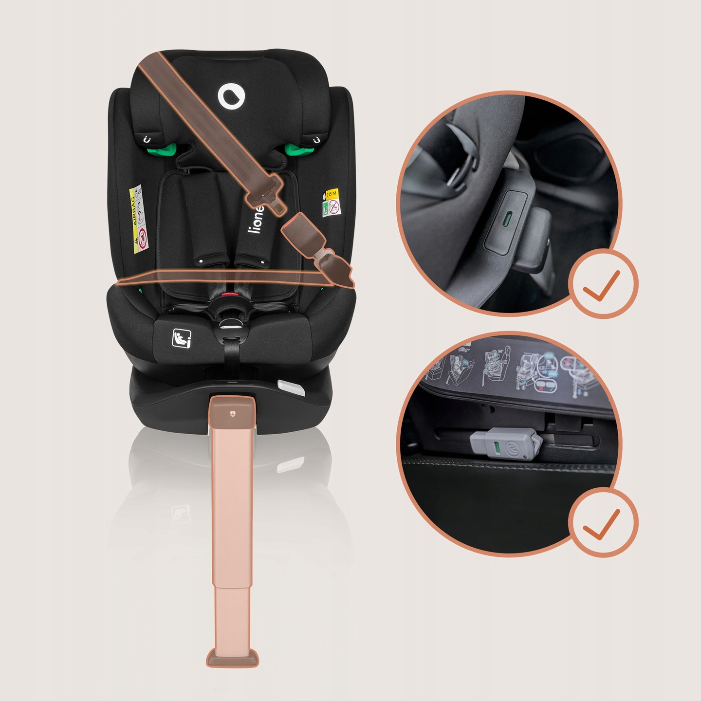 Montaż odbywa się za pomocą bazy Isofix oraz nogi stabilizującej. W przypadku starszych dzieci (100-150 cm) możesz korzystać z zaczepów Isofix oraz pasa samochodowego lub zdecydować się wyłącznie na pas.