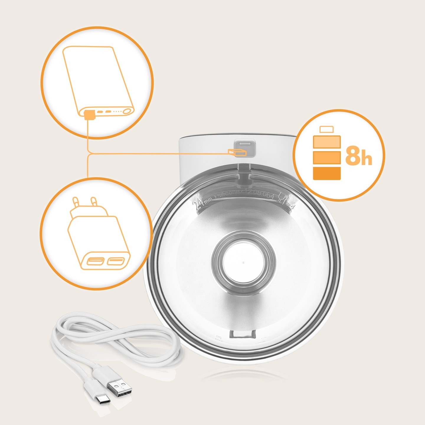 | Wyposażenie w zestawie: | Laktator, Trzy silikonowe lejki o średnicach: 24mm, 21mm, 17mm, Zawór silikonowy, Pojemnik o pojemności 180ml, Przewód zasilający USB o długości 1m, Ramiączko przedłużające do biustonosza, Bawełniany woreczek do przechowywania laktatora |