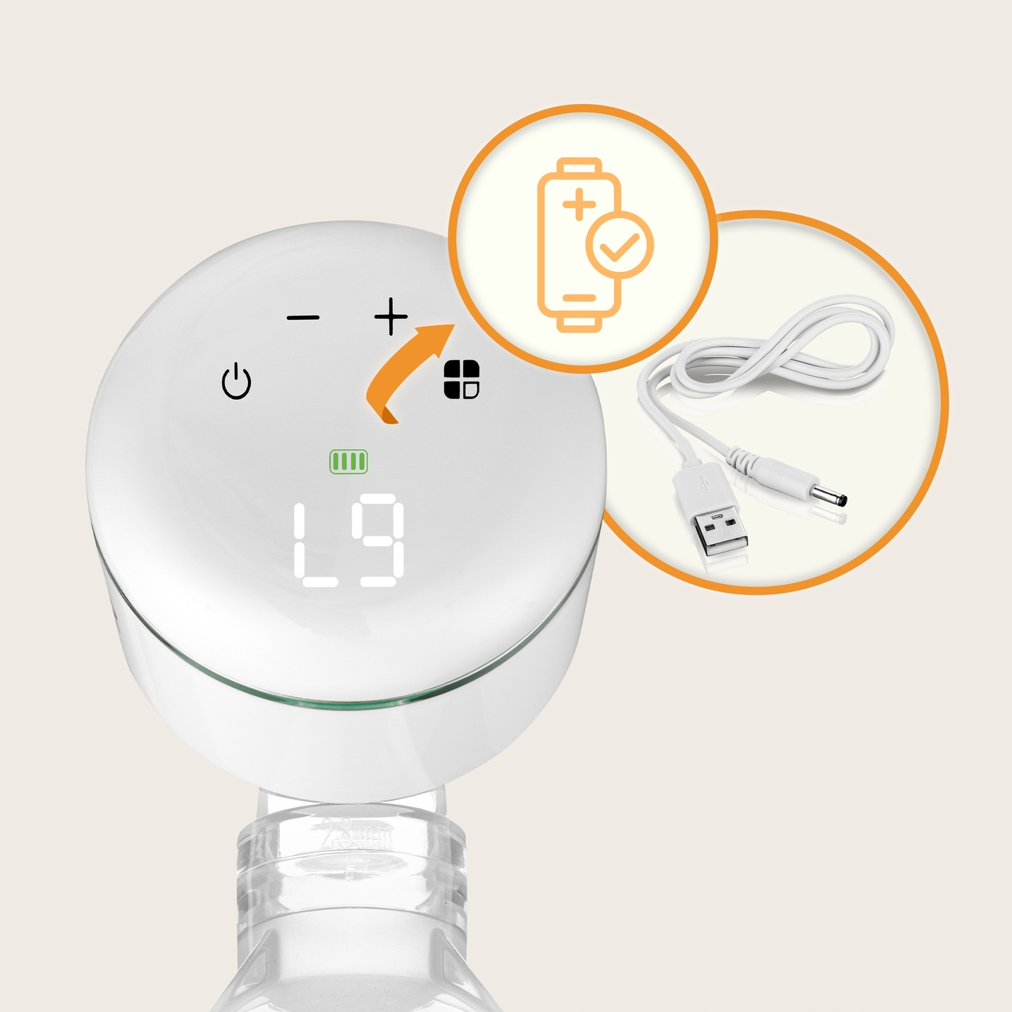 Pojemna bateria pozwala na pracę urządzenia przez nawet 150 minut, co gwarantuje 5 pełnych sesji odciągania.
