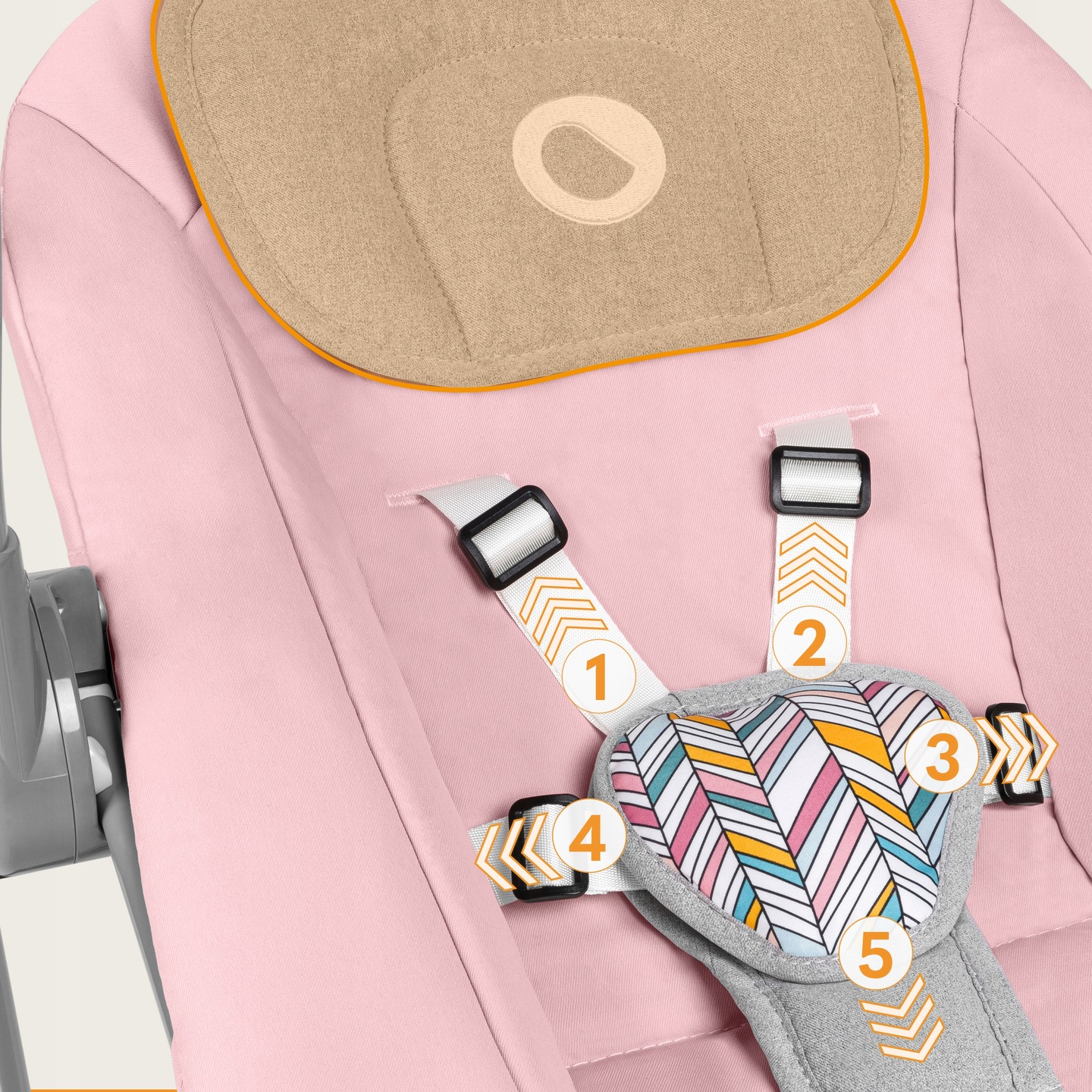 Wytrzymałe, przyjazne dla skóry pasy zapewniają większe bezpieczeństwo – gwarantują, że dziecko nie wypadnie z bujaczka.