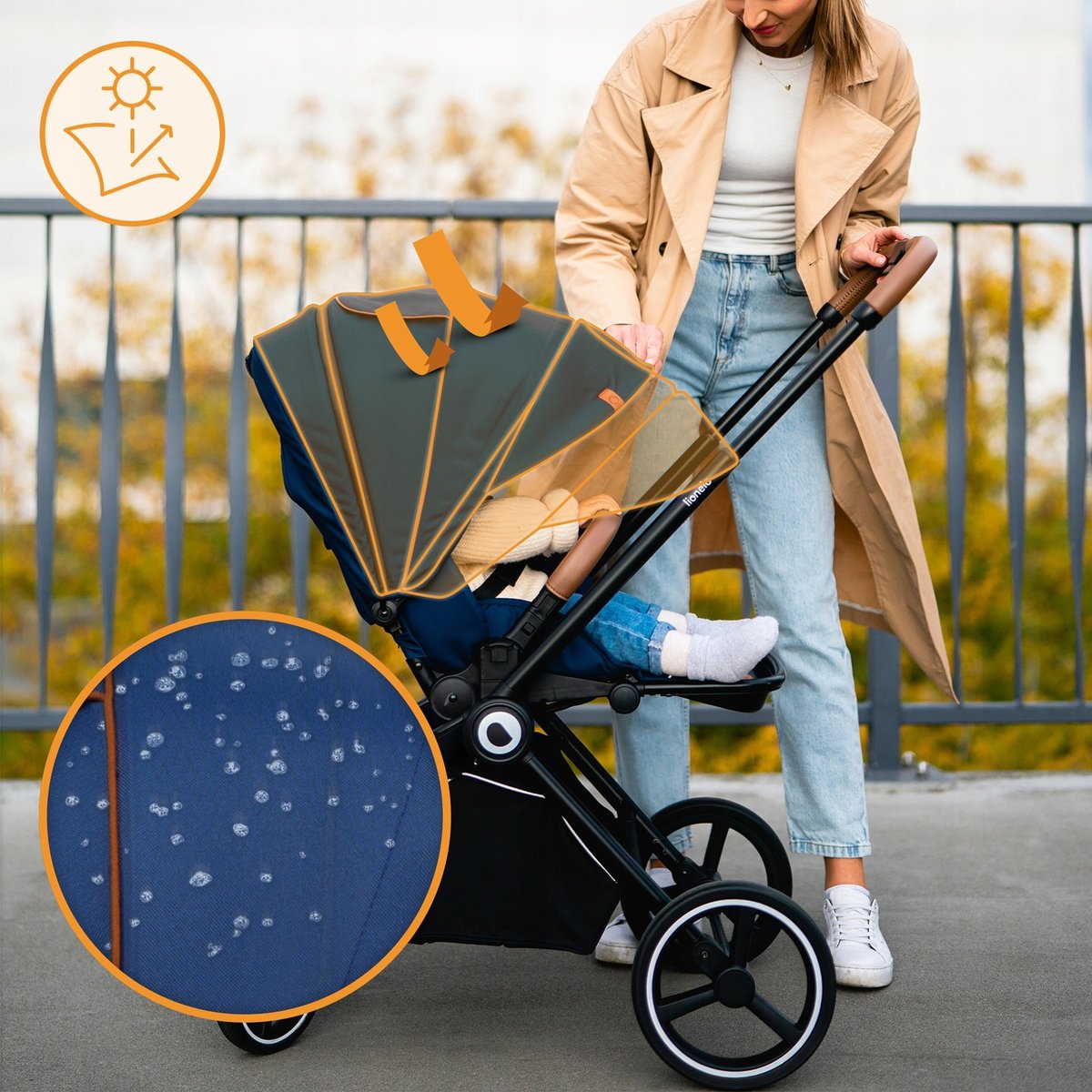✔️ Przedłużana budka z okienkiem i filtrem UPF 50+ – chroni przed deszczem, wiatrem i słońcem. Wykonana z materiału hydrofobowego zapewniającego wodoodporność.