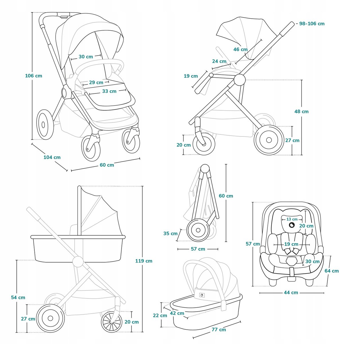 | Wyposażenie w zestawie: | fotelik, gondola, spacerówka |
