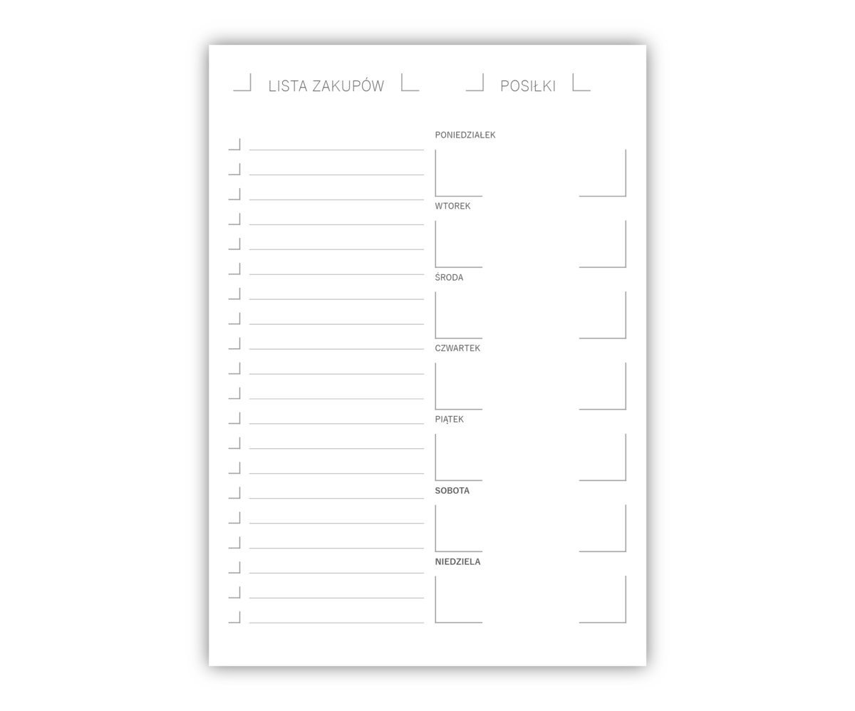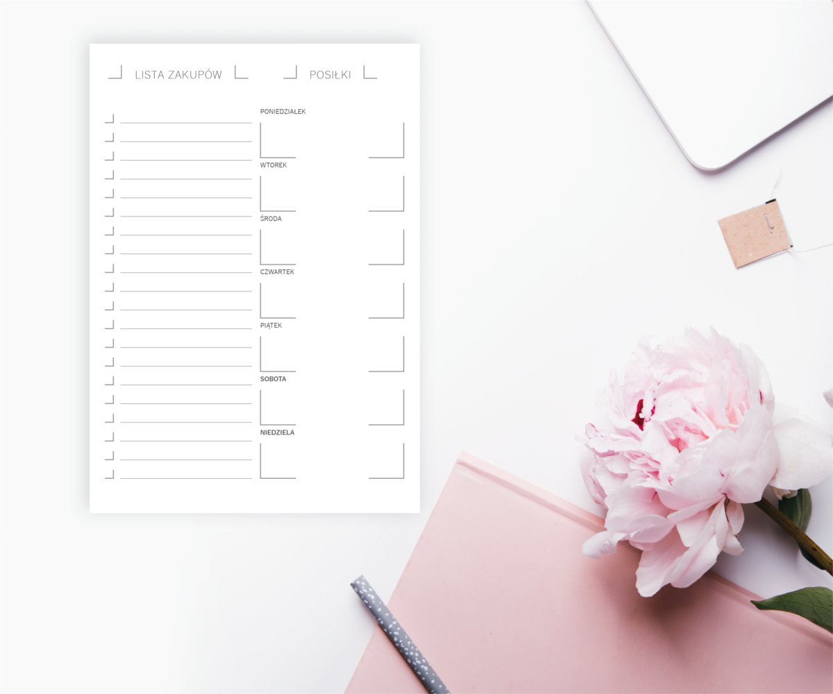 Optymalna grafika, która zawiera duży napis „lista zakupów”, puste wypunktowanie, oraz listę posiłków na każdy dzień tygodnia.