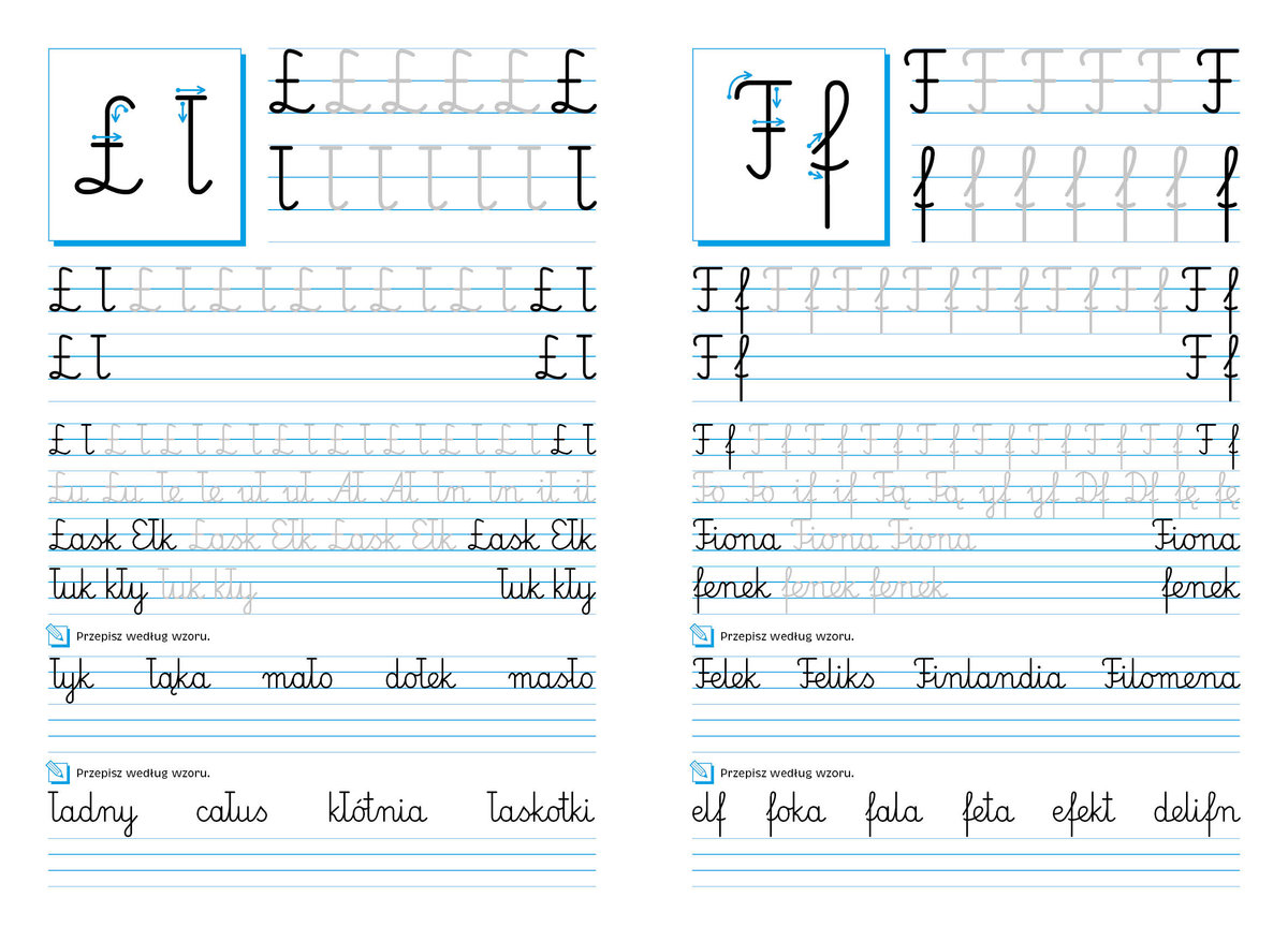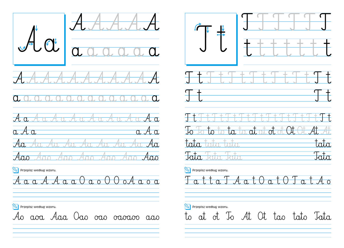 Zeszyt do doskonalenia i ćwiczenia pisania odręcznego oraz właściwego łączenia liter, przeznaczony dla dzieci z pierwszych klas szkoły podstawowej.