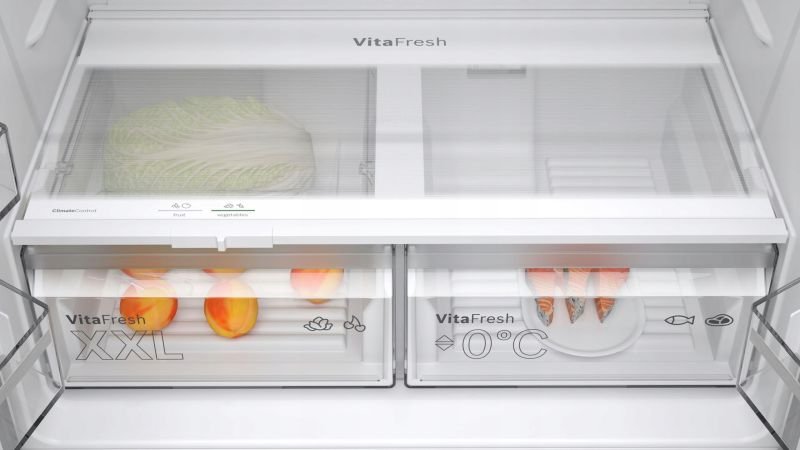 Przestronna strefa VitaFresh XXL <0°C> oferuje idealne warunki do przechowywania świeżej żywności. Utrzymuje temperaturę niższą dla mięsa i ryb oraz zapewnia wyjątkową świeżość owocom i warzywom w szufladach z perfekcyjnie dobranym poziomem wilgotności. Owoce i warzywa dzięki odpowiednim warunkom będą w dobrej kondycji zachowując cenne witaminy i pozostaną świeże na dłuższy czas. Więcej jedzenia, mniej marnowanego jedzenia!