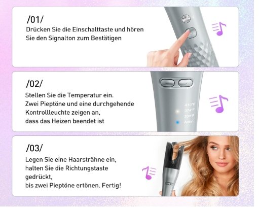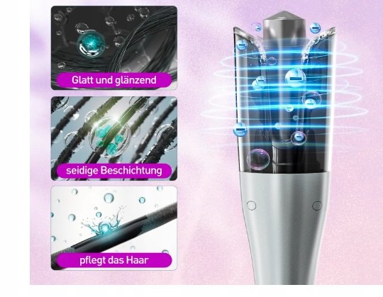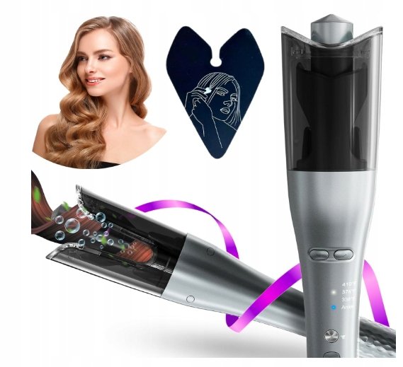 - Automatyczne nawija – samooczyszczający się mechanizm pozwala uniknąć plątania się pasm, wystarczy włożyć włos i nacisnąć przycisk.