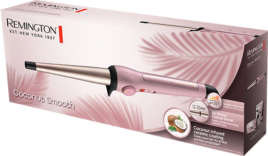 Lokówka Coconut Smooth marki Remington to stylowe, niezwykle kobiece urządzenie umożliwiające tworzenie loków o różnej średnicy dzięki lokówce stożkowej wand. To także sprytny pomysł na zapobieganie elektryzowaniu się włosów i ich wygładzenie po stylizacji – wszystko to dzięki mikrocząsteczkom odżywki kokosowej wbudowanym w ceramiczną powłokę grzałki!