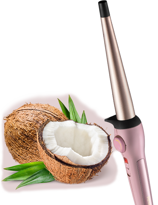 Ceramiczna powierzchnia grzałki lokówki ma wbudowane mikrocząsteczki kokosowej odżywki. Kokos, który słynie z wysokiej zawartości kwasów tłuszczowych, efektownie wygładza loki, nadając im jedwabistego połysku, i chroni przed skutkami stylizacji termicznej, zapobiegając niszczeniu się struktury włosa.