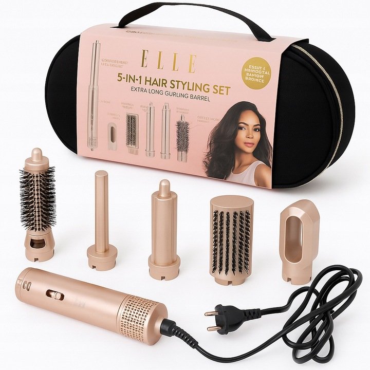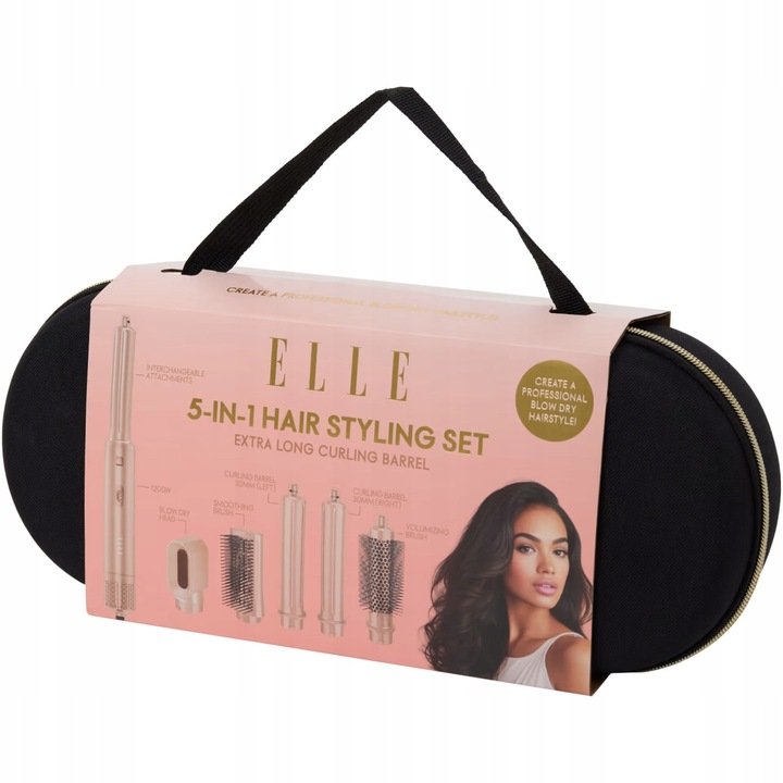 Przechowywanie – Wszystkie akcesoria można łatwo przechować w luksusowej walizeczce dołączonej do zestawu. Lokówko suszarka 5 w 1 wielofunkcyjne urządzenie do stylizacji włosów Elle Stan opakowania oryginalne
